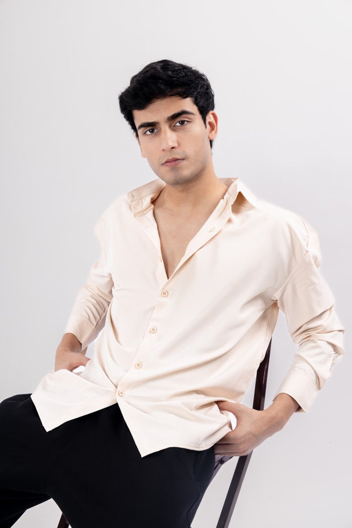 Korean Style Men's Loose Fit Draped Shirt with Lapel, Solid Creamy Colour